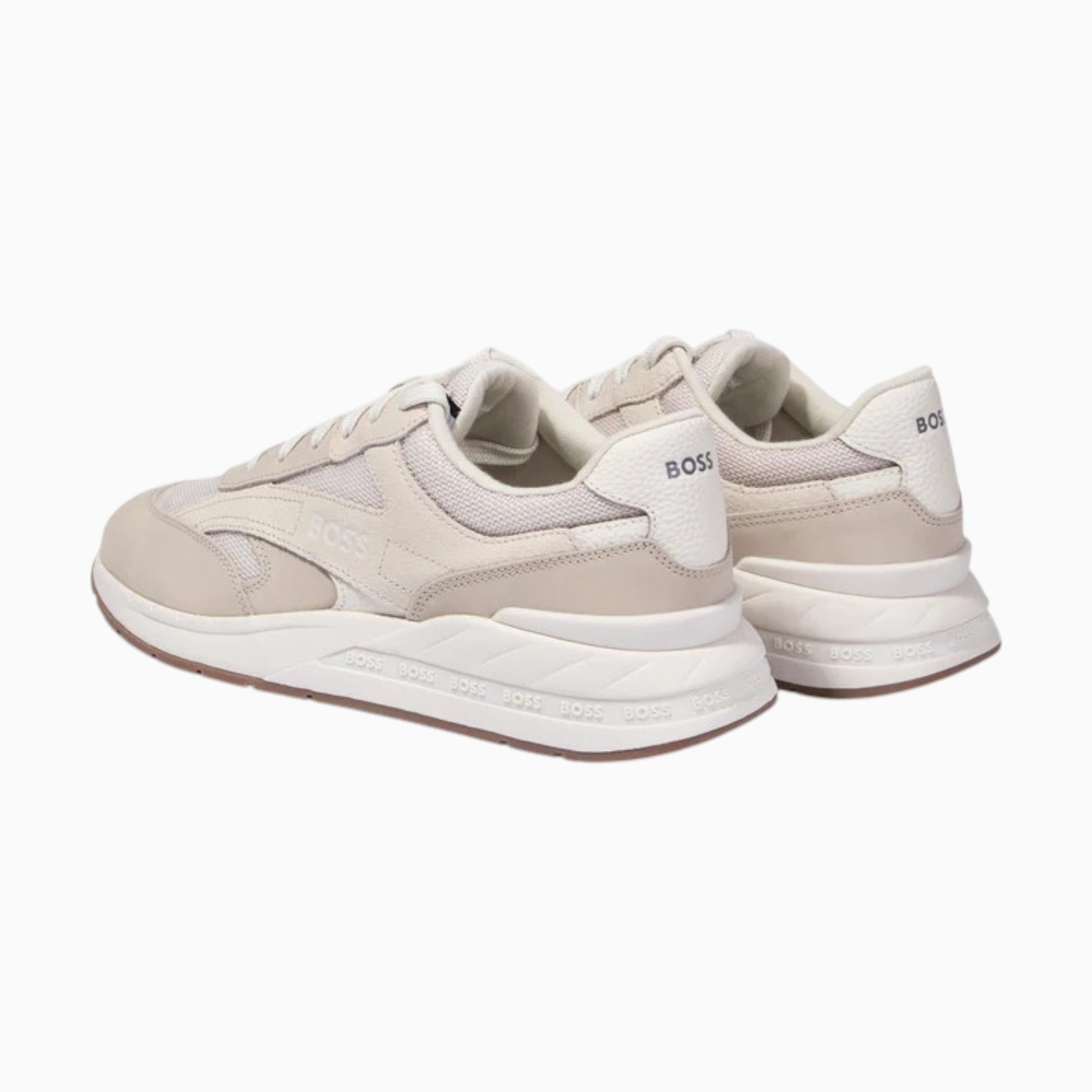 Las zapatillas Kurt Runn, confeccionadas con materiales mixtos en beige, son unas zapatillas de materiales mixtos con una construcción de paneles combinados. Un diseño transpirable que incorpora paneles de ante, cuero y malla. Presentan una suela interior en contraste, con la marca BOSS en relieve en la puntera. Este modelo también luce la marca BOSS repetida en la entresuela trasera.