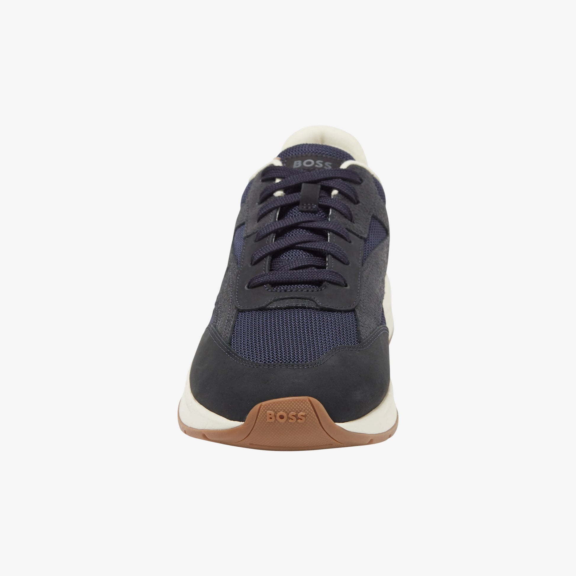 Las zapatillas Kurt Runn, confeccionadas con materiales mixtos en azul oscuro y beige, son unas zapatillas de materiales mixtos con una construcción de paneles combinados. Un diseño transpirable que incorpora paneles de ante, cuero y malla. Presentan una suela interior en contraste, con la marca BOSS en relieve en la puntera. Este modelo también luce la marca BOSS repetida en la entresuela trasera.
